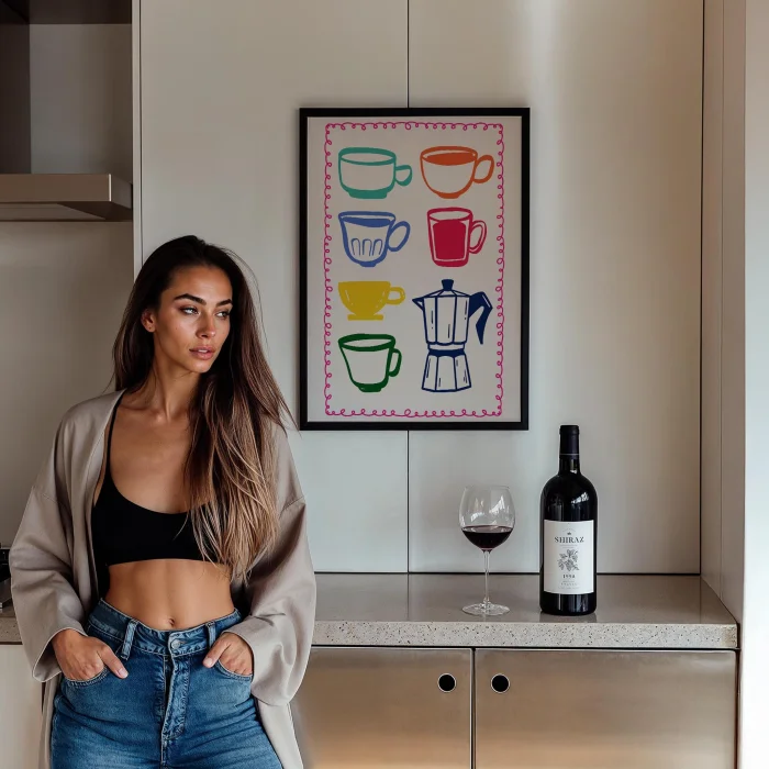 Ürün: Kahve Kupaları Ve Moka Pot Renkli Minimal Çizimler Mutfak Duvar Tablosu