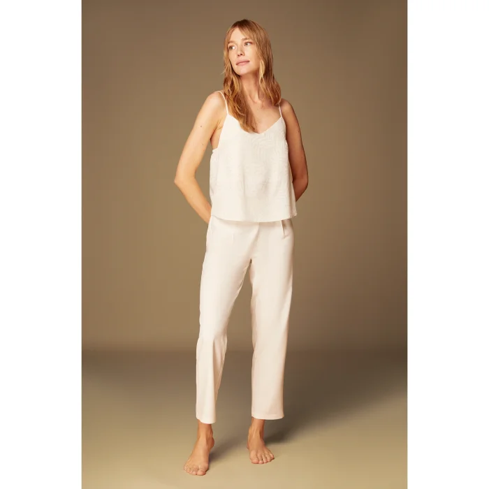 Tüm yaş gruplarına uygun tasarımıyla herkesin rahatlıkla tercih edebileceği bir pijama takımı; Dokuma kumaş yapısı sayesinde dayanıklılık ve konforu bir arada sunar; %50 viskoz, %35 polyester ve %15 keten materyal bileşeni ile yumuşak dokunuşu ve nefes alabilirliği garanti eder; Düz kesimiyle sade ve şık bir görünüm sağlar, iç giyim koleksiyonunuzun vazgeçilmez parçası olur;