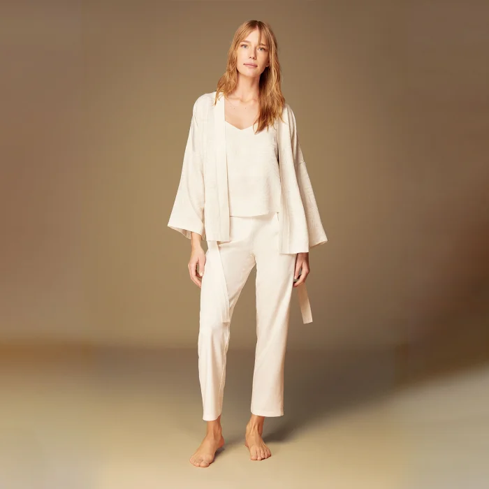 Tüm yaş gruplarına uygun tasarımıyla herkesin rahatlıkla tercih edebileceği bir pijama takımı; Dokuma kumaş yapısı sayesinde dayanıklılık ve konforu bir arada sunar; %50 viskoz, %35 polyester ve %15 keten materyal bileşeni ile yumuşak dokunuşu ve nefes alabilirliği garanti eder; Düz kesimiyle sade ve şık bir görünüm sağlar, iç giyim koleksiyonunuzun vazgeçilmez parçası olur;