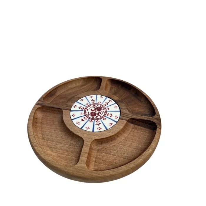 Sınıf masif cevizden üretilmiş çini boyama yapılarak dekoratif hale getirilmiş sunum tabağı.Kuruyemiş,peynir ve atıştırmadıklarınızı şık şekilde sunabileceğiniz ahşap tabak