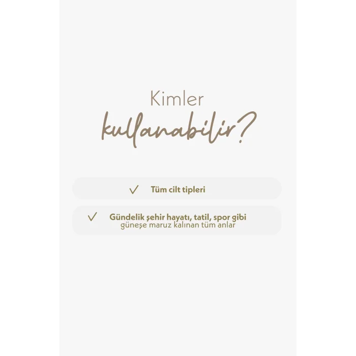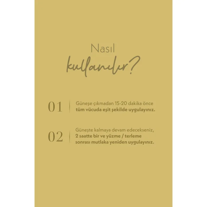 Güneşe çıkmadan 15 dakika önce tüm vücuda eşit şekilde uygulayın. Terleme, yüzme veya havluyla kurulanma sonrası tekrar edilmesi önerilir.
