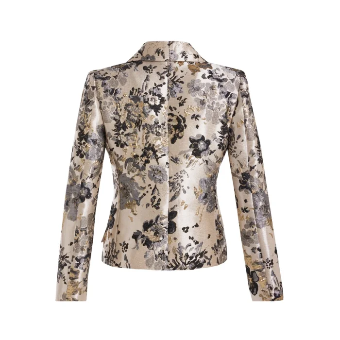 Jakarlı ve simli brokar dokuma kumaş, klasik kesim ceket.