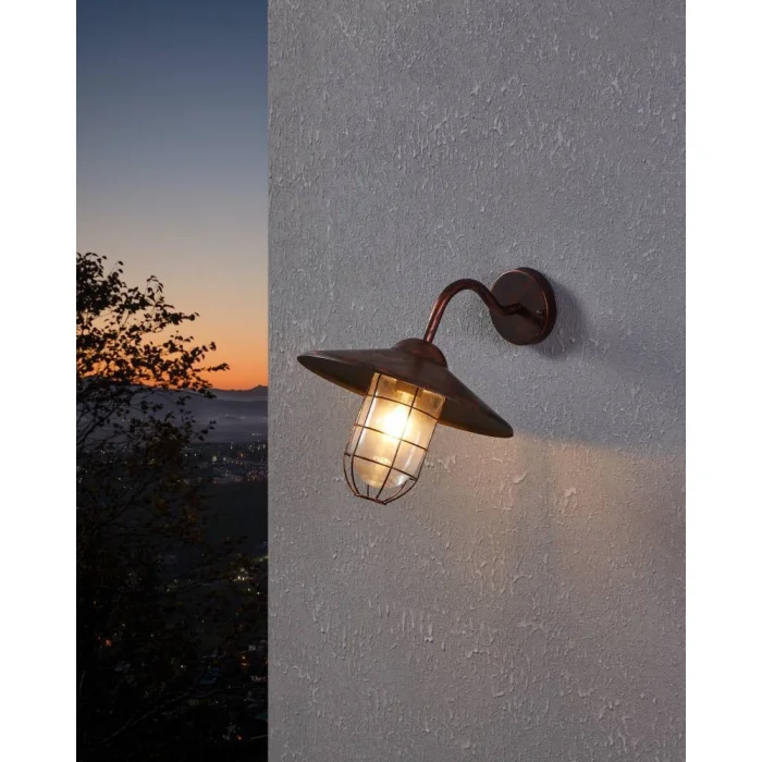 Ampul Duy Tipi:E27 Maksimum Watt: 1X60W Ürün Yüksekliği: 25 cm Ürün Uzunluğu: 30 cm Provizyon Çıkıntısı: 38 cm Net Ağırlık: 1.92 Kg Ana Materyal: Galvanize Çelik Ana Renk: Bakır Renkli-Antika Cam/Şapka Materyali: Cam Cam/Şapka Rengi: Şeffaf IP Durumu: IP44 Fonksiyonlar: Köşe Bağlantısı Anahtar Tipi: Duvar Anahtarı Ürün Voltajı: 220-240V,50/60Hz