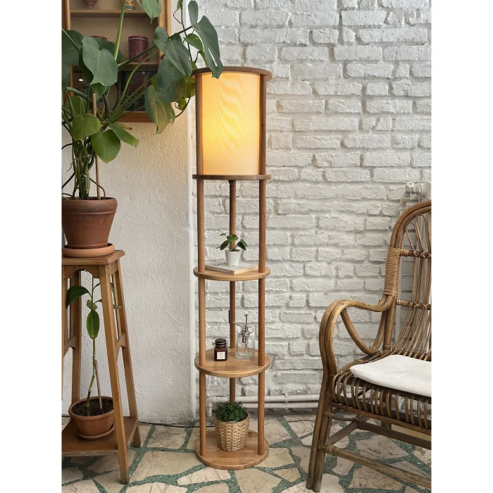 Ürün: Lona Raflı Lambader, 3 Katlı Ahşap Zemin Aydınlatması, Keten Abajurlu Masif Modern Dekoratif Lamba