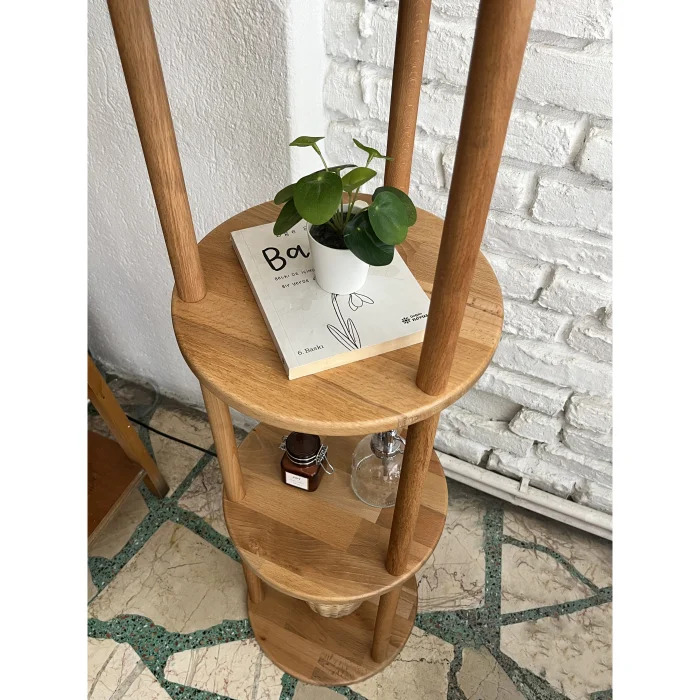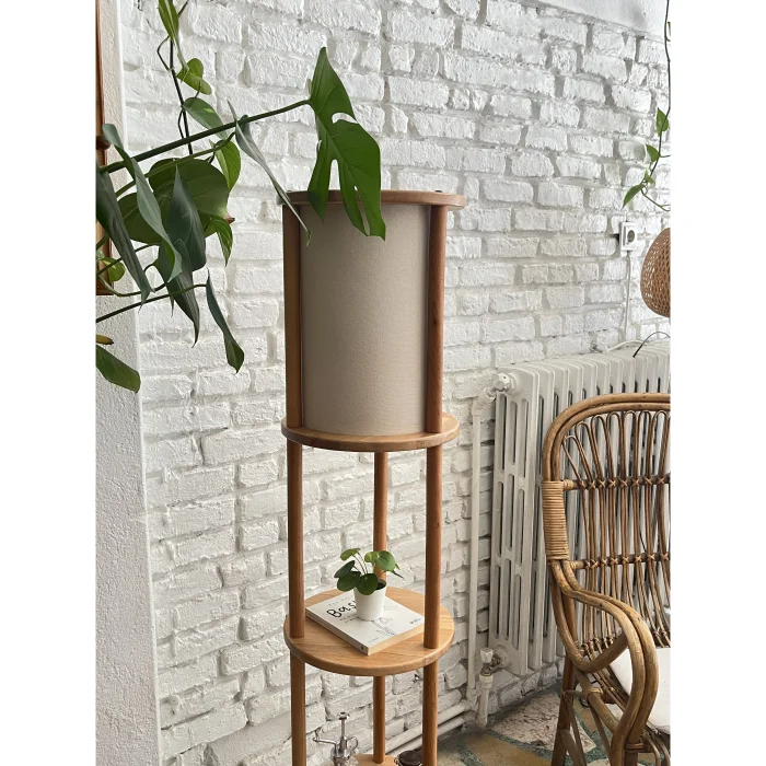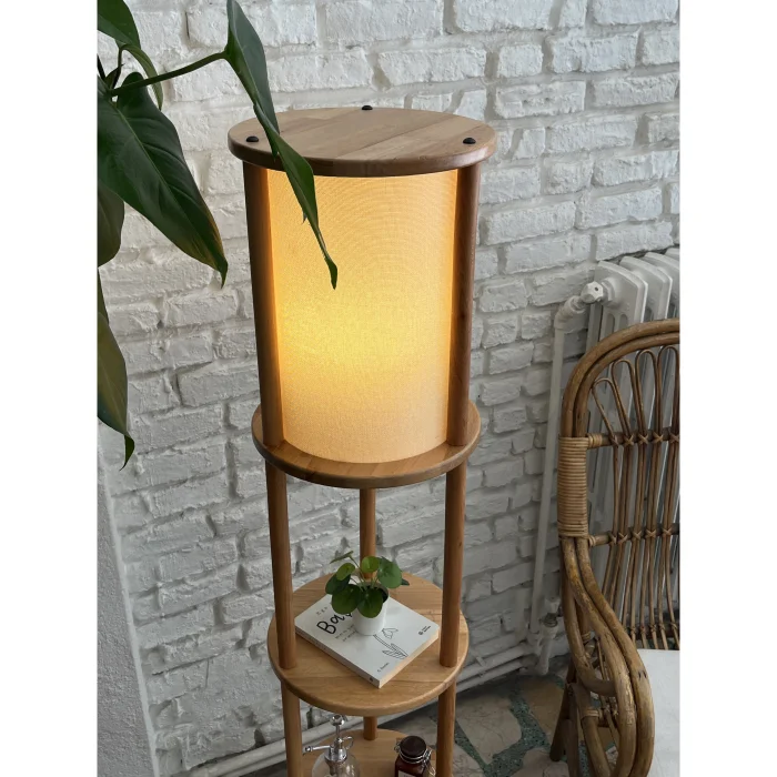 Ahşap görünümlü silindir gövdesi, zarif keten kumaş abajurla birleşerek bulunduğu ortama sıcak ve huzurlu bir hava katar. Rafları; kitap, küçük bitkiler, mumlar veya dekoratif objeler için ideal bir sergileme alanı sunar.