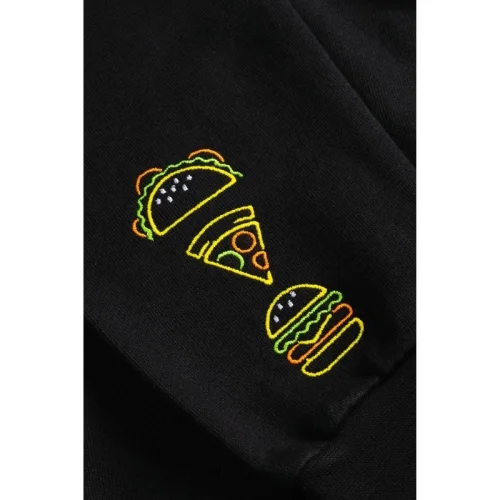 Sweatshirtlerde kullanılan desenler neon iplik kullanılarak nakış tekniği ile işlenmiştir.