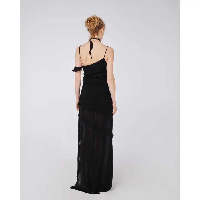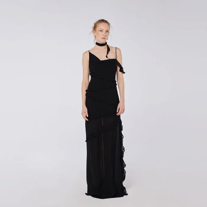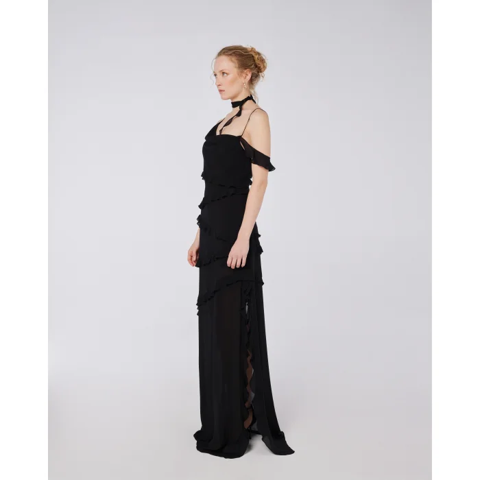 Akıcı formu cesur fırfır detaylarıyla birleştiren bu maxi elbise, etkileyici bir siluet sunarak sofistike ve göz alıcı bir akşam şıklığı yaratıyor.