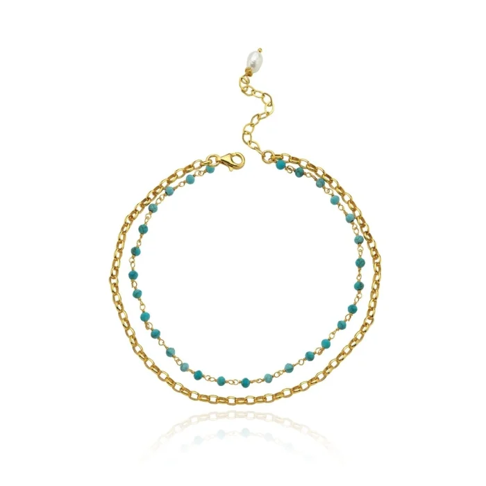 925 Ayar Gümüş 22 Ayar Altın Kaplama Turkuaz Taşlı kullanılmıştır. Halhal Uzunluğu: 23cm + 5 cm uzatma zincir Halhal Gram: 5,57gr