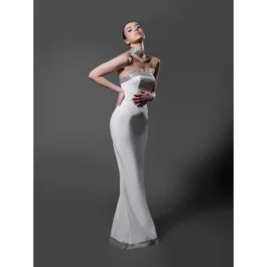 Boyun detaylı küçük parlak taşlarla işlenmiş beyaz uzun elbise.