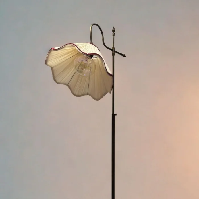 Kıvrımlı formu, pliseli şifon kumaş abajuru ve bordür kenar şeridiyle detaylandırılmış şapka yapısı sayesinde yaşam alanlarına hafif ve zarif bir görünüm kazandırır.