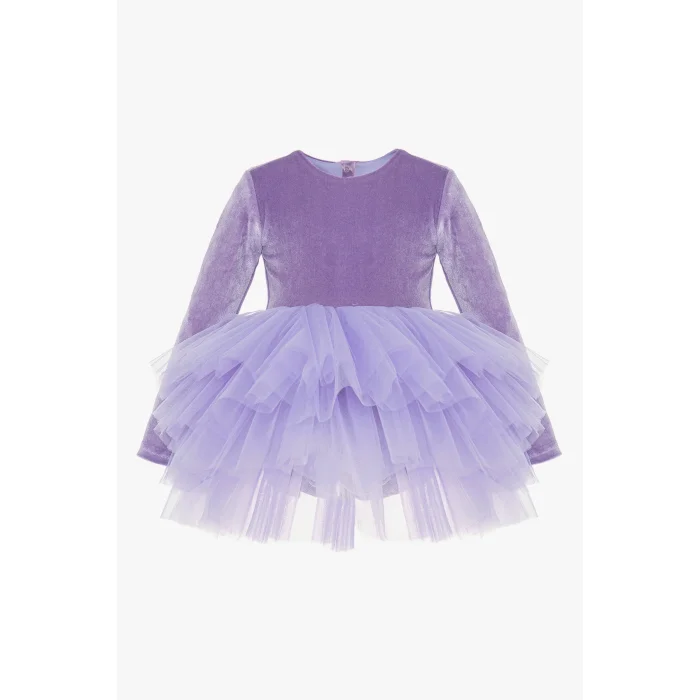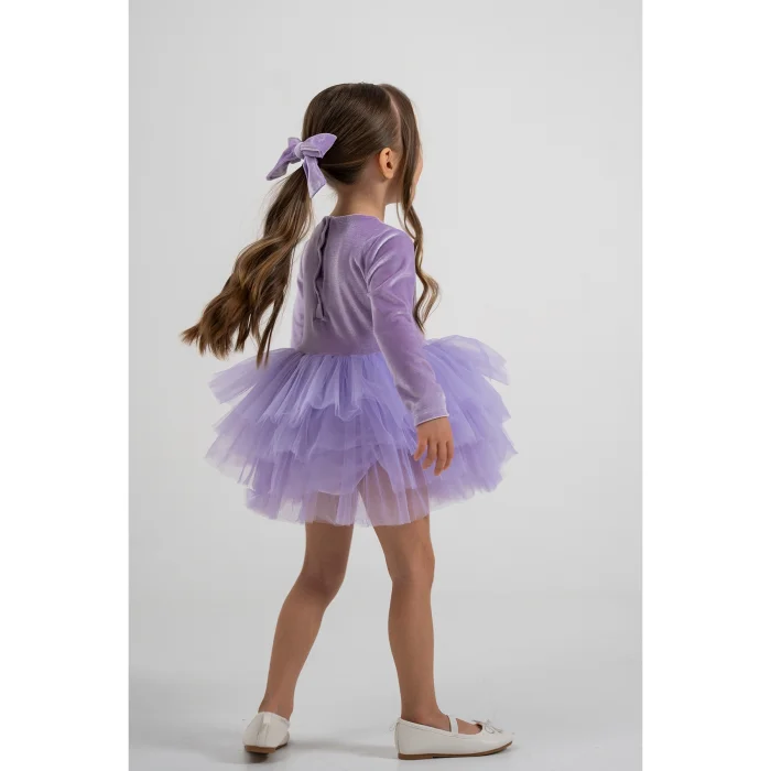 Bisiklet yaka, sırtı pat kapama detaylı lila kadife tütü elbise. Tütü etek altında çıtçıtlı mayo şeklinde astarı mevcuttur.