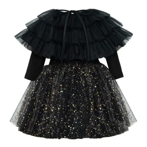 Bisiklet yaka, sırtı açık ve boyundan bağlama detaylı kırık beyaz tütü elbise. Tütü etek altında çıtçıtlı mayo astarı mevcuttur.