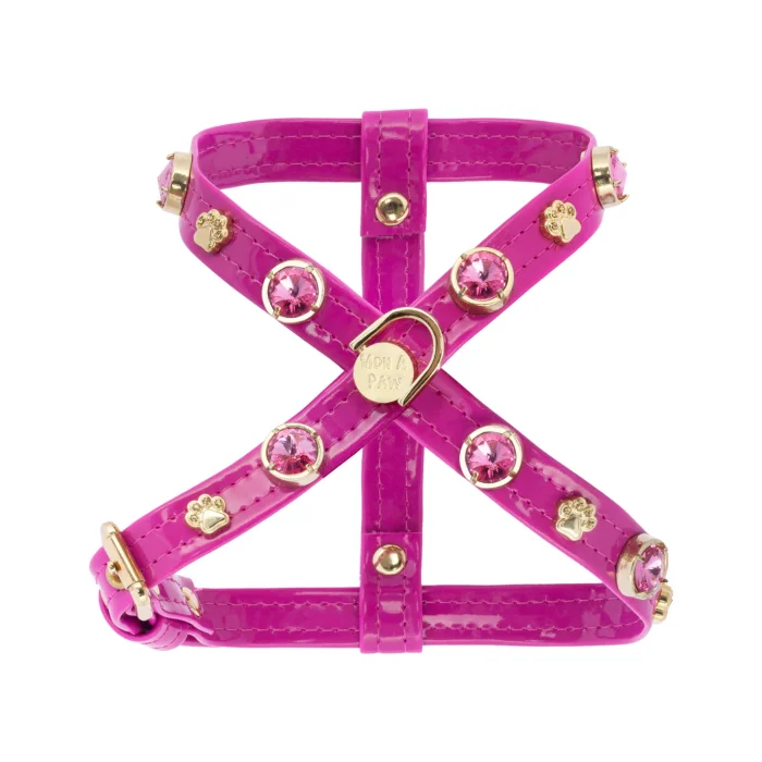 Parlak fuşya pembe vegan dostu parıltılı deri üzerine parıldayan pembe Swarovski kristalleri ve altın kaplama minik patiler ile zarif bir şekilde süslenmiştir. Bu tasarım, hem günlük kullanım için mükemmel bir seçenek sunarken hem de özel günlerde köpeğinizin stilini tamamlamak için benzersiz bir aksesuar olacaktır. Aynı renkteki Swarovski kristalleri ile bezenmiş gezdirme kayışı ile köpeğinizin görünümünü tamamlayabilirsiniz.