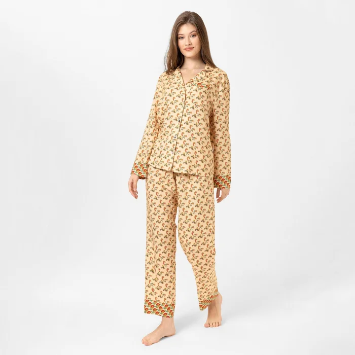 Çiçek desenli özel dijital baskı, Hera pijama takım. Kol ve paçalardaki farklı desen şık bir görünüm sunar. Kemeri sayesinde pantolon belinize göre ayarlanabilir. Önden düğmeli üstü emzirenler için kullanım kolaylığı sağlar.