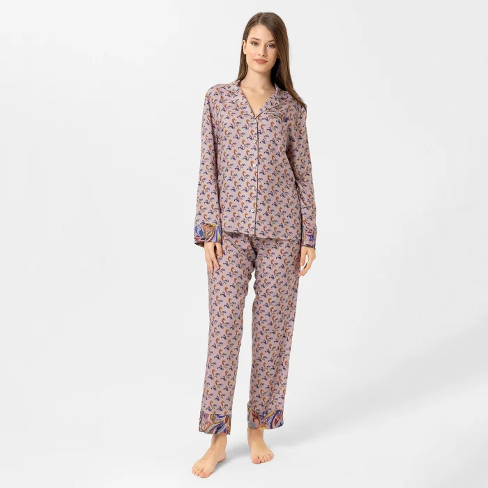 Lila, çiçek desenli özel dijital baskı, Hera pijama takım. Kol ve paçalardaki farklı desen şık bir görünüm sunar. Kemeri sayesinde pantolon belinize göre ayarlanabilir. Önden düğmeli üstü emzirenler için kullanım kolaylığı sağlar.