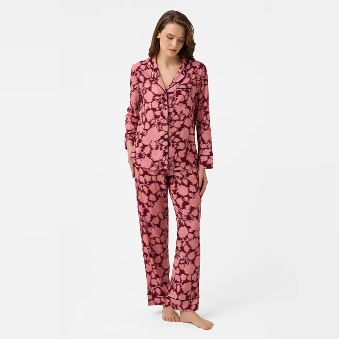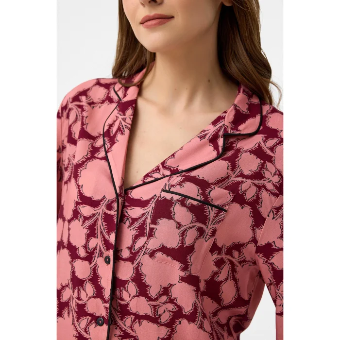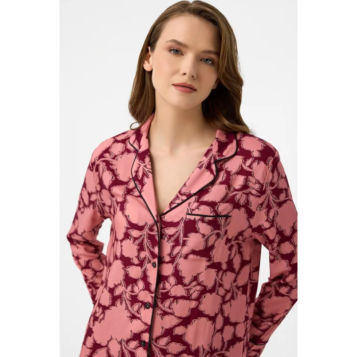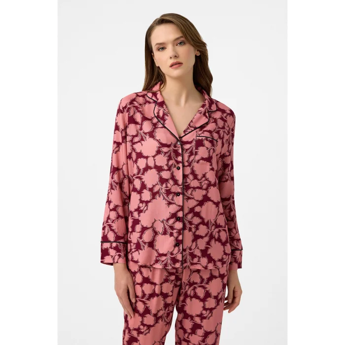 Bordo çiçek desenli özel dijital baskı, Hera pijama takım. Siyah biyeleri şık bir görünüm sunar. Kemeri sayesinde pantolon belinize göre ayarlanabilir. Zarif deseni ve dökümlü kumaşıyla evde şık ve rahat olmaya özen gösterenlerin tercihi. Önden düğmeli üstü emzirenler için kullanım kolaylığı sağlar. Aynı desen kimonosu ile kombin yapılabilir.