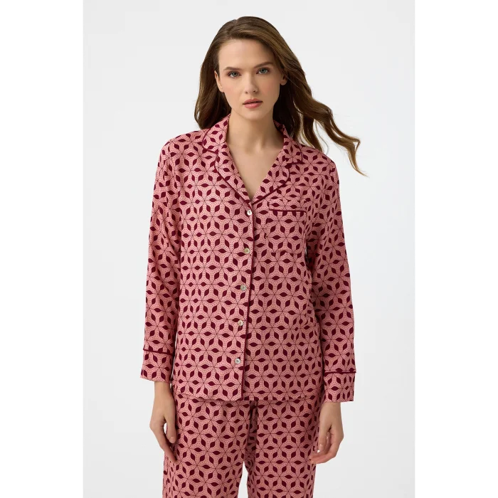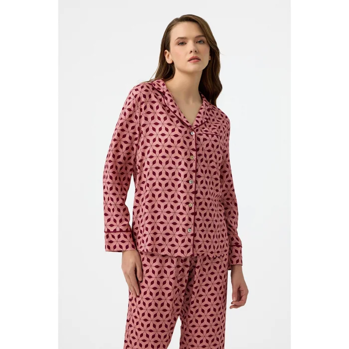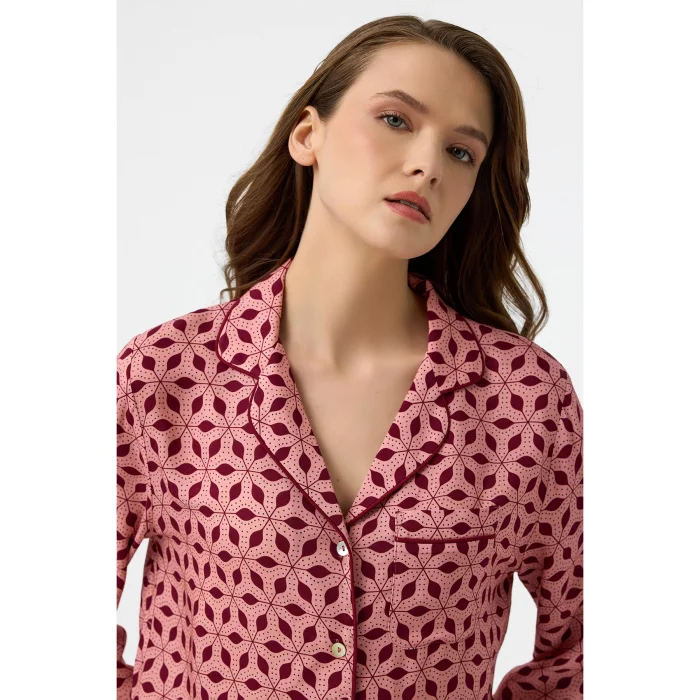 Bordo desenli özel dijital baskı, Hera pijama takım. Bordo biyeleri şık bir görünüm sunar. Kemeri sayesinde pantolon belinize göre ayarlanabilir. Zarif deseni ve dökümlü kumaşıyla evde şık ve rahat olmaya özen gösterenlerin tercihi. Önden düğmeli üstü emzirenler için kullanım kolaylığı sağlar.