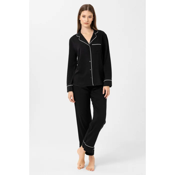 Siyah Hera pijama takım. Beyaz biyeleri şık bir görünüm sunar. Kemeri sayesinde pantolon belinize göre ayarlanabilir. Önden düğmeli üstü emzirenler için kullanım kolaylığı sağlar.