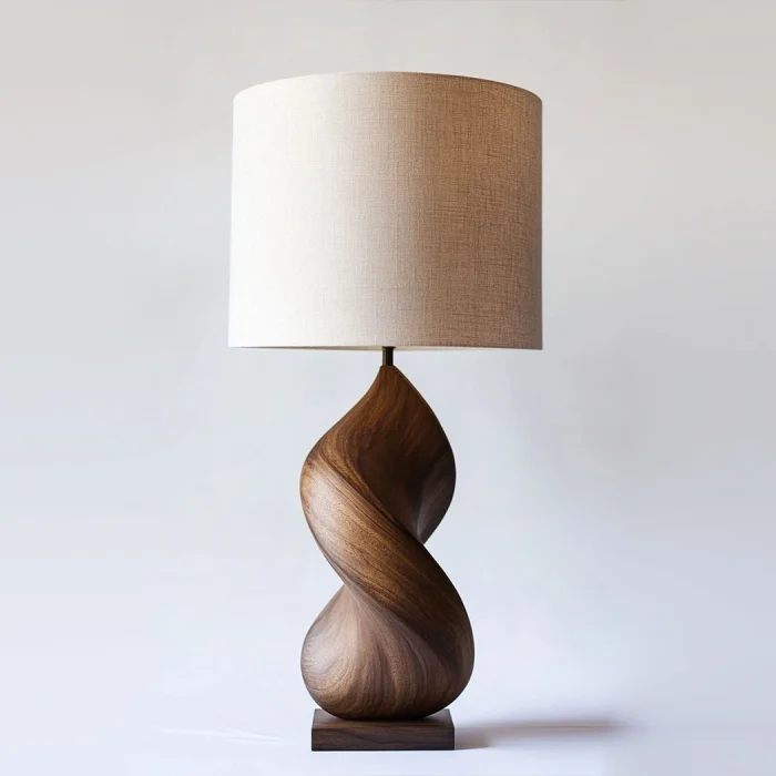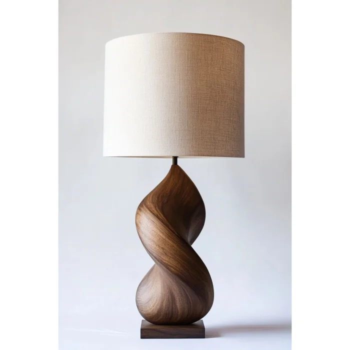 Evinizin veya ofisinizin atmosferini tamamlayacak zarif bir dokunuş: Doğal Ahşap Aydınlatma. Doğal ceviz tonlarındaki el yapımı ahşap gövdesi ve sade, silindirik krem rengi abajuru ile hem modern hem de bohem dekorasyon stillerine mükemmel uyum sağlar.