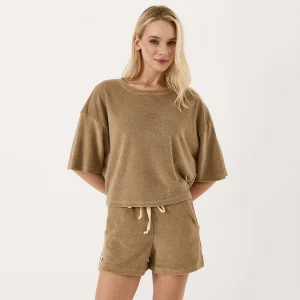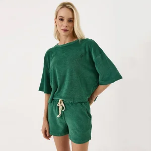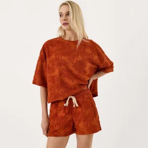 Oversize kalıbı ve düşük omuz kesimi, beden hareketlerini kısıtlamadan modern bir görünüm sağlar. Dört renk seçeneğiyle her bir model kendi karakterini taşır: Bej modelde güneş, yeşilde kaktüs, hakide yaprak nakışı ve turuncuda desenli yaprak dokusu yer alır. Takım şortuyla birlikte ya da tek başına rahatça kombinlenebilir.
