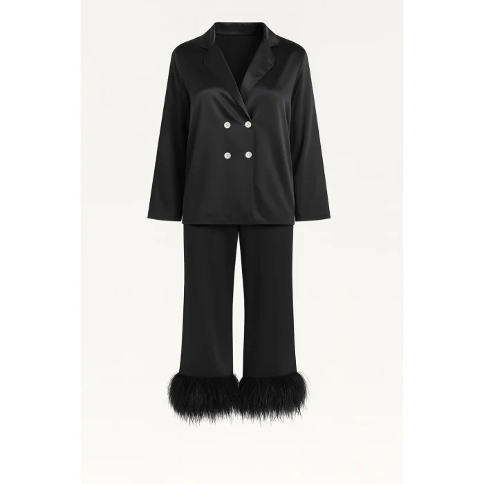 Sedef düğmeleri, el işçiliğiyle tamamlanan zarif kol dikişleri ve paçalardaki tüy (otriş) detaylarıyla her anınıza sofistike bir ışıltı katar.