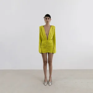 Details with modern charm add movement to the silhouette of the Spanish sleeved natte dress. The elegant design is complemented by padded details, a deep V-neck at both the front and back, and a flowing mini dress crafted from soft-textured fabric. ✓ Draped Detail ✓ Spanish Sleeve ✓ V-neck ✓ Lined ✓ Jersey Fabric ✓ Front Length 15.75 inches ✓ Skirt Length: 15.75 inches