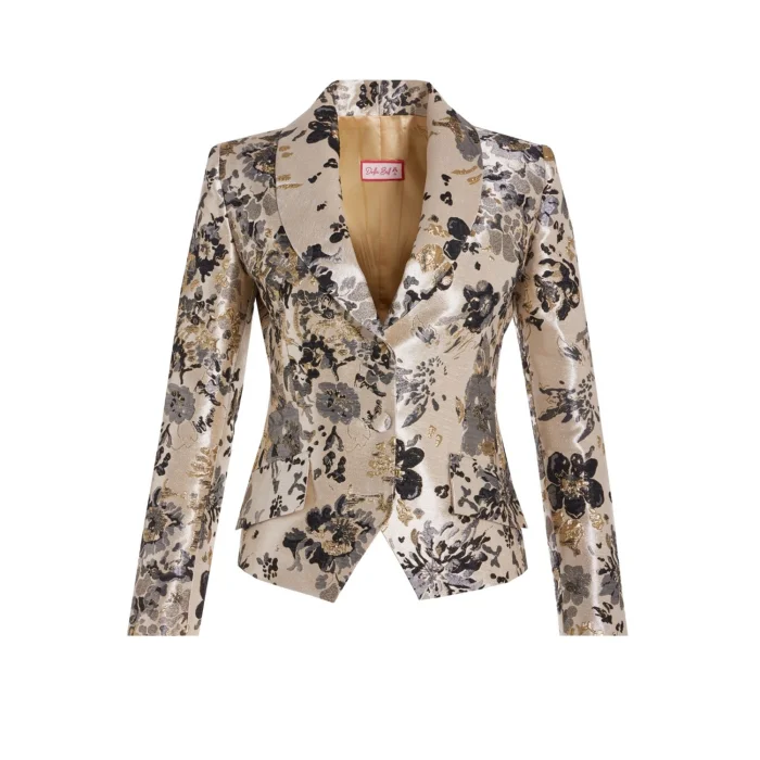 Jacquard and metallic brocade woven fabric, classic-cut jacket.