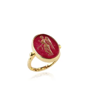 The Peace Angel Ring bears the name of Athena, who planted the olive tree and gave a beautiful gift to the world. The olive branch was a symbol of victory and peace in ancient Greek mythology. Angels known as God's helpers and messengers, angels holding an olive branch embroidered with 22K Gold Vermeil on Pink Agate, speak of hope, resurrection and peace. To complement the craftsmanship in the stone, the carvings are decorated with gold leaf.