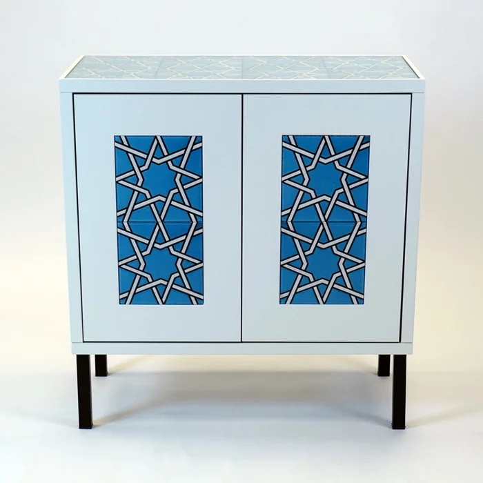 This version of the Golden Console features special ceramic panels inspired by Seljuk geometric patterns. The white lacquered finish creates a balanced contrast with the ceramic surfaces in blue tones. With modern lines, this console is a contemporary interpretation of a traditional motif.