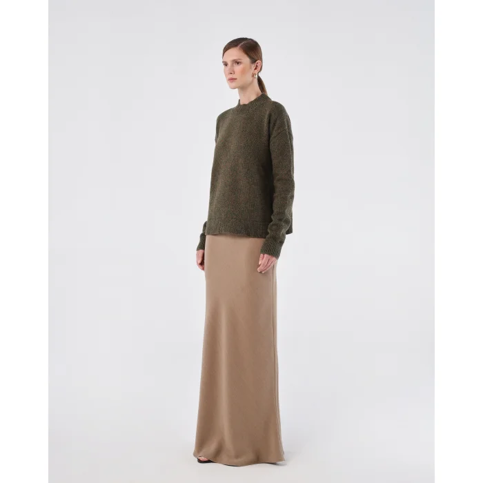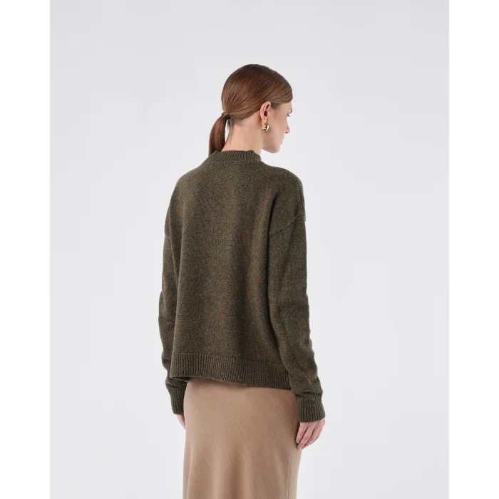 Made from a luxurious alpaca blend, offering warmth and a soft, comfortable feel. Muline knit design adds subtle texture and depth to the fabric. Classic crew neckline and relaxed fit provide a timeless and versatile look. Ribbed cuffs and hem offer a snug, comfortable fit while maintaining structure. Model is 174 cm tall and is wearing size Small. This alpaca muline sweater combines coziness and effortless style, perfect for layering or wearing on its own during cooler days.