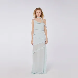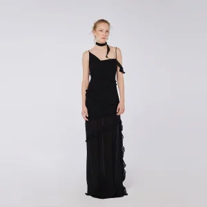 A refined and dramatic evening dress, combining effortless fluidity with bold ruffle accents for a statement-making silhouette.