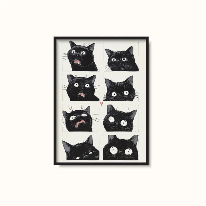 A photo strip that captures joyful moments of feline states and reactions. All kinds of kitty, biting in all its forms.