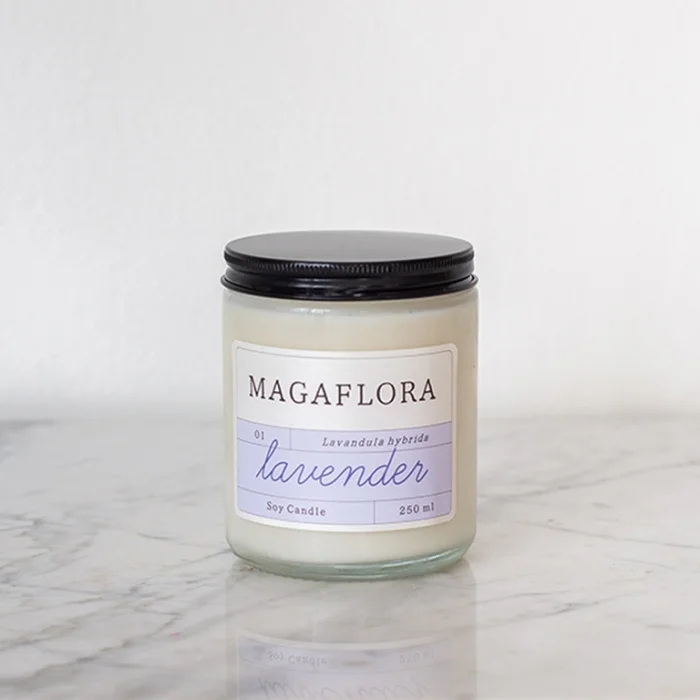 Lavender soy candle is handmade with natural ingredients. It contains Lavandula hybrida (hybrid lavender) essential oil and soy wax. It's in a 250 ml amber glass jar.