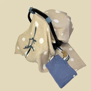 The front of our shoulder cloth consists of 4 layers of polka dot mink-beige muslin and the back of it consists of 2 layers of solid colored muesli. Due to its multi-layered nature, it is both very soft and very absorbent.