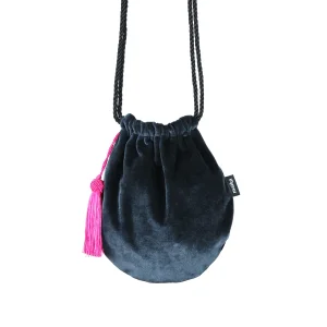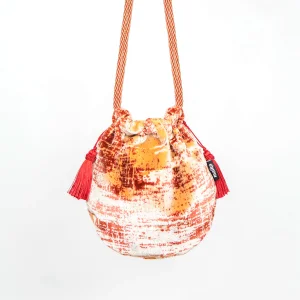 Cotton velvet fabric, satin lining, Lilac color, patterned, Lilac tassel detail, Purple cordon strap, side label  Height : 26 cm. Width : 25 cm. Hanger length: 60 cm.