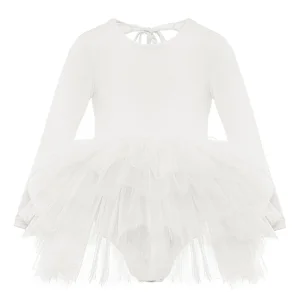Off-white tutu dress with crewneck, backless and necktie detailing. There is a swimsuit lining with snaps under the tutu skirt.