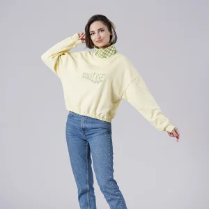 Elastic waist sweatshirt with “Nonsénse” embroidery on the front with a checked pattern on the collar. Model wears size S.