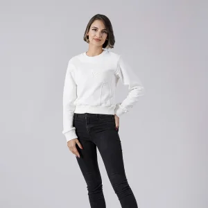 Two-coloured sweatshirt with long sleeves, crew-neck and a front seam detail. Model wears size S.