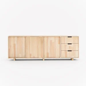 This handcrafted wood sideboard offers a blend of modern style and versatile functionality. With three spacious drawers on the right and smooth-sliding doors on the left, it serves perfectly as a buffet cabinet, media console, or stylish storage solution. Ideal for organizing dinnerware, electronics, or records, this Scandinavian-inspired piece combines natural solid wood with clean lines, making it a standout addition to any room. Its customizable design allows it to seamlessly fit into dining rooms, living rooms, or any modern home decor setting.