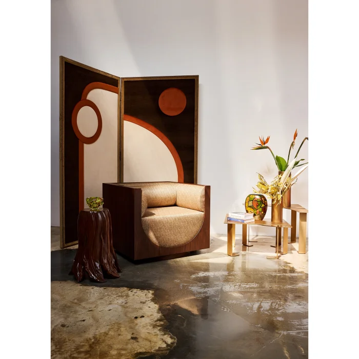 Cube Lounge, where cubic contours and soft interior curves are balanced, offers comfort that surrounds with simplicity. The interior space, created with circular lines, physically draws the user in, while at the same time exhibiting a sculptural stance in the space. The contrast between the harsh geometry of its outer layer and the curves of the inner surfaces creates a modernist expression. Cube Lounge, which has a timeless design, is not just a seating unit; It is the focal point of the space. Product Dimensions:. Height : 75 m. Depth: 80 cm. Length : 85 cm. Seat Height: 42 cm. Seat Depth: 66 cm.. Material: Walnut veneer on MDF, Woven Fabric.