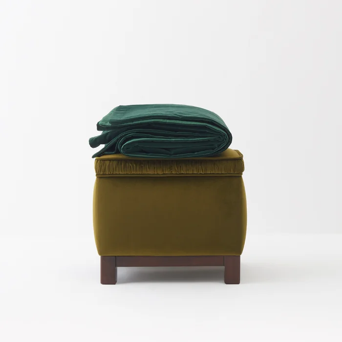 Green velvet throw with terry cotton lining.  Filled  with fiber. Comes with custom dust bag.