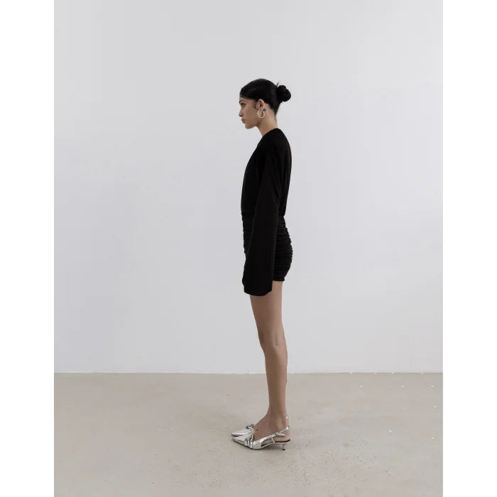Details with modern charm add movement to the silhouette of the Spanish sleeved natte dress. The elegant design is complemented by padded details, a deep V-neck at both the front and back, and a flowing mini dress crafted from soft-textured fabric. ✓ Draped Detail ✓ Spanish Sleeve ✓ V-neck ✓ Lined ✓ Jersey Fabric ✓ Front Length 15.75 inches ✓ Skirt Length: 15.75 inches