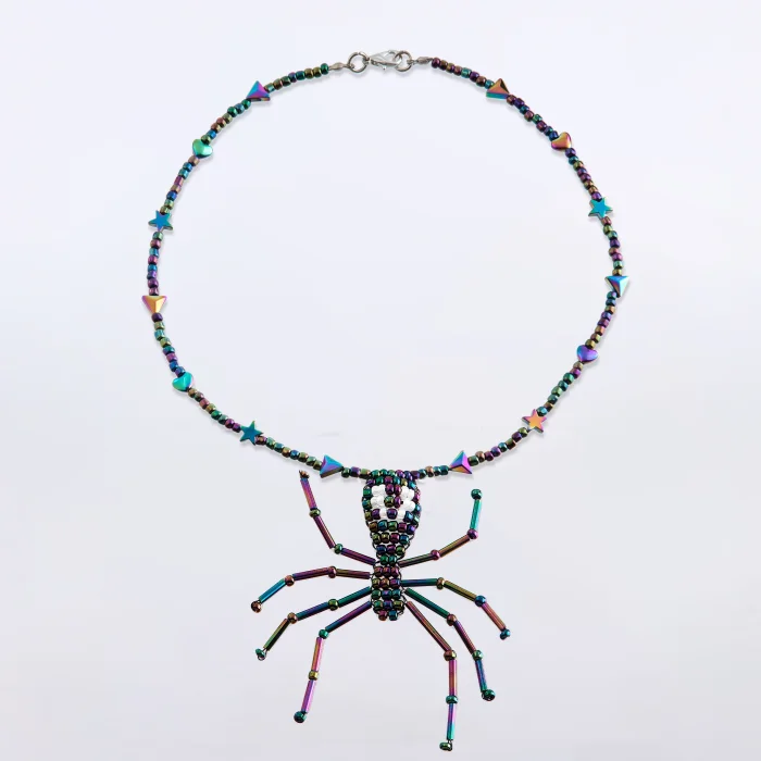 Reptiloid figure necklace with tarnished steel intermediate material, decorated with hematite natural stones, knitted with sand beads.