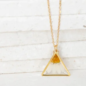 Stainless steel & resin necklace with dried real daisies inside. Triangle side length 18 mm