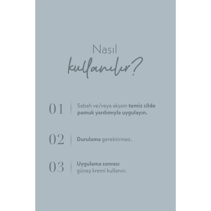 Apply morning and evening to clean skin with a cotton ball. It does not require rinsing. Then you can apply serum and moisturizer.