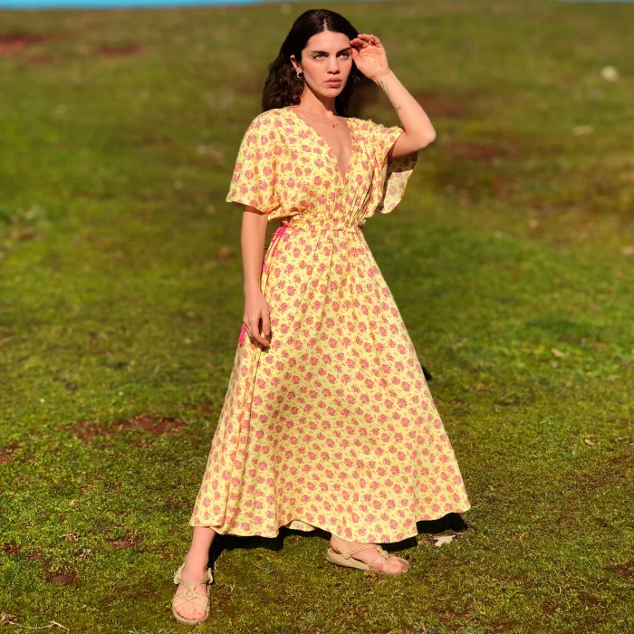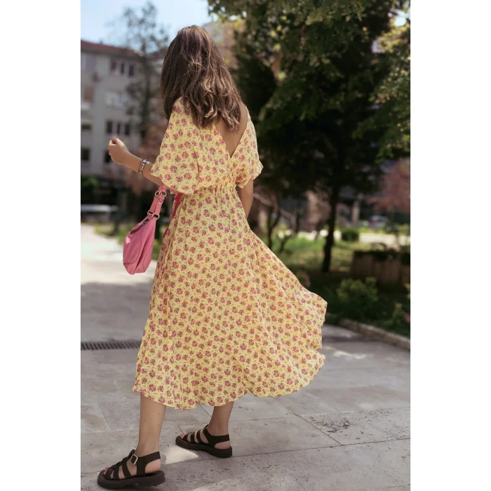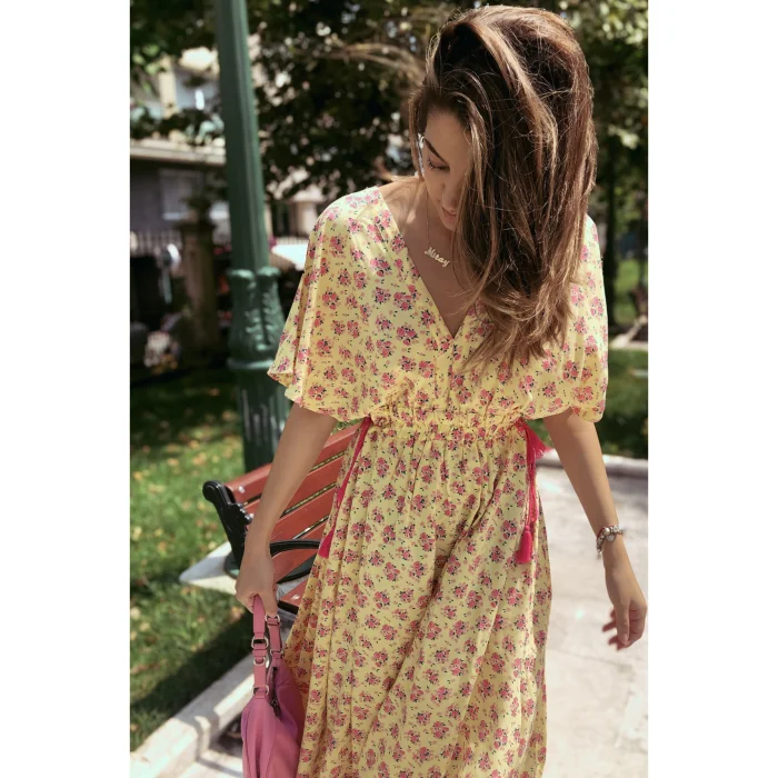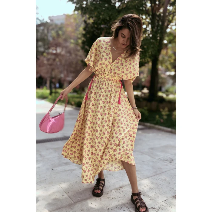 - Dress length: 124 cm - Waist: 38 cm Since it is rubberized, the waist can expand up to 47 cm and narrow up to 25 cm.