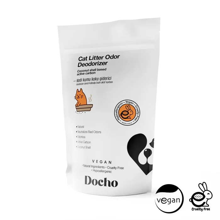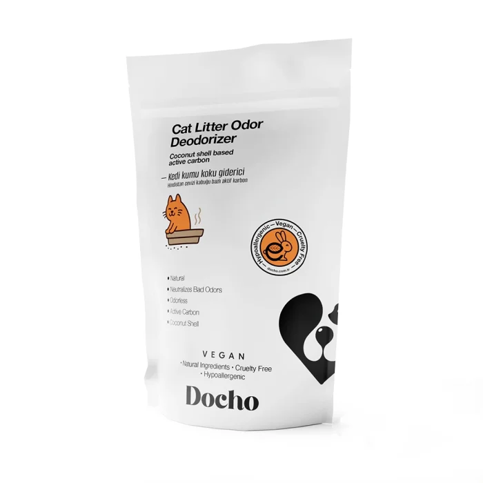 Docho Cat Litter is specially formulated to provide effective control of bad odors with its coconut shell-based activated carbon content. This special formula prevents odor formation by trapping the molecules that make up the odor, thus eliminating odor problems in your home. Thanks to its high molecular binding feature, it extends the life of the sand, thus providing longer use. Docho Cat Litter makes your cute friend's toilet experience more enjoyable and helps you keep the air of your home fresh and clean.• Neutralizes bad odors.• It does not contain chemicals.• It is perfume-free.• It increases the clumping of cat litter. CoconutIt is a completely additive-free product with natural ingredients obtained from coconut shells. MoreOdorlessThanks to its odorless structure, it provides use without disturbing. MoreActivated CarbonActivated carbon can effectively absorb and retain gases, liquids and solids thanks to its adsorption property. MoreActivated CarbonActivated carbon can effectively absorb and retain gases, liquids and solids thanks to its adsorption property. How Do We Use More? It is used by pouring it into a sand container and mixing it with sand. How much? It is recommended to add 3 tablespoons (50 – 70 g) to an average litter box and mix. To which region? Directly into the cat litter. Additional Tips? Thanks to its high molecular binding feature, it extends the life of the sand. Frequently Asked QuestionsWhat Does Docho Activated Carbon & Coconut Extract Cat Litter Deodorizer Do? Docho Activated Carbon & Coconut Extract Cat Litter Deodorizer is designed to effectively control bad odors. Activated carbon and coconut extract neutralize the foul odors emitted from the cat litter, trapping and neutralizing the molecules that make up the odor. By preventing odor formation, it keeps the cat's toilet clean and fresh. In this way, it prevents the formation of unpleasant odors in your home. Docho Activated Carbon & Coconut Seed Litter is chemical-free. Therefore, it controls bad odors without harming your pet's health. How to Use Docho Activated Carbon & Coconut Extract Cat Litter Deodorizer? Clean the cat toilet and dispose of the old litter. It is important to remove all old sand and clean the toilet. In an average litter box, pour 3 tablespoons of Docho Activated Carbon & Coconut Extract Cat Litter Deodorizer on the floor of the cleaned toilet. Allow your cat to use the toilet normally. How Many Weeks Is Docho Activated Carbon & Coconut Extract Cat Litter Deodorizer Effective? The effectiveness of Docho Activated Carbon & Coconut Extract Cat Litter Deodorizer may vary depending on the frequency of use, the cat's toilet habits, and the way the litter is cleaned. In order for the sand to maintain its effectiveness, it is important to clean it regularly and completely replace it if necessary.