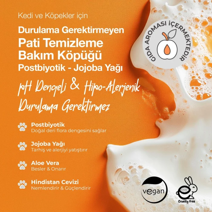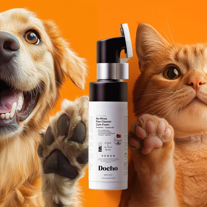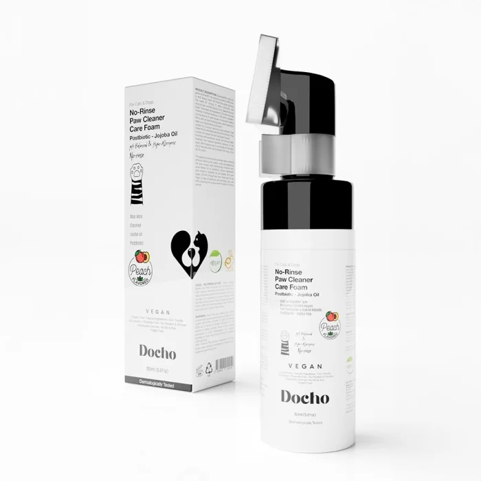 Designed to clean your cats' and dogs' paws quickly and effectively, Docho Rinse-Free Paw Cleaning & Care Foam offers practical and gentle care. Thanks to its postbiotic content, it ensures the hygiene of the paws, strengthens the skin barrier and helps keep them healthy. With its special formula containing water, glycerin, preservative, EDTA, betaine, aloe vera, coconut, oat extract and panthenol, it deeply moisturizes, soothes and protects the paws against external factors. This foam, which quickly removes dirt and bacteria from outside, is ideal for daily use.• Nourishes and strengthens the hair with its rich vitamin content.• Moisturizes and soothes the skin. • Protects hairs and provides natural shine.• Gently cleans hairs and makes combing easier. Aloe VeraPromotes moisturizing of the skin and relieves inflammation, providing a relaxing effect on the skin. MoreJojoba OilMaintains the moisture balance of the skin, nourishes the hair and gives shine. It also softens dry areas on the skin. MoreCoconutNourishes, moisturizes and softens hair, supports the health of the skin. MorePostbioticSupports the skin flora and maintains the natural balance of the skin, contributing to a healthy skin appearance. Learn MoreHow Do We Use It? It is applied to the paws of cats and dogs by massaging in circular motions with the help of a silicone cap. How much? It is suitable for daily use. To which region? It is applied to the paws of cats and dogs. When? You can use it when you need quick cleaning after coming from outside or when you prefer not to wash with water. Additional Tips? After cleaning, the batches are wiped with a dry cloth. Frequently Asked QuestionsDocho Rinse-Free Paw Cleaning & Conditioning Foam - What is a Postbiotic Product? Docho Rinse-Free Paw Cleaning and Care Foam is a product developed for paw hygiene and health. It provides deep cleaning of dirt on paws without the need for rinsing. It helps to reduce irritation, allergies, crusting and redness on the skin. It also contributes to keeping the natural skin flora in balance and preventing possible skin diseases, lesions or allergies. What is the Use and Dosage of Docho Rinse-Free Paw Cleaning and Care Foam - Postbiotic Product? Shake gently before using the product. The pump with a special silicone head allows the product to pass into a foam form. Apply the resulting foam to the paws by massaging in circular motions with the help of a silicone cap. The product has a formula that does not require rinsing. After the cleaning process is finished, wipe the paws with a dry cloth or paper towel.