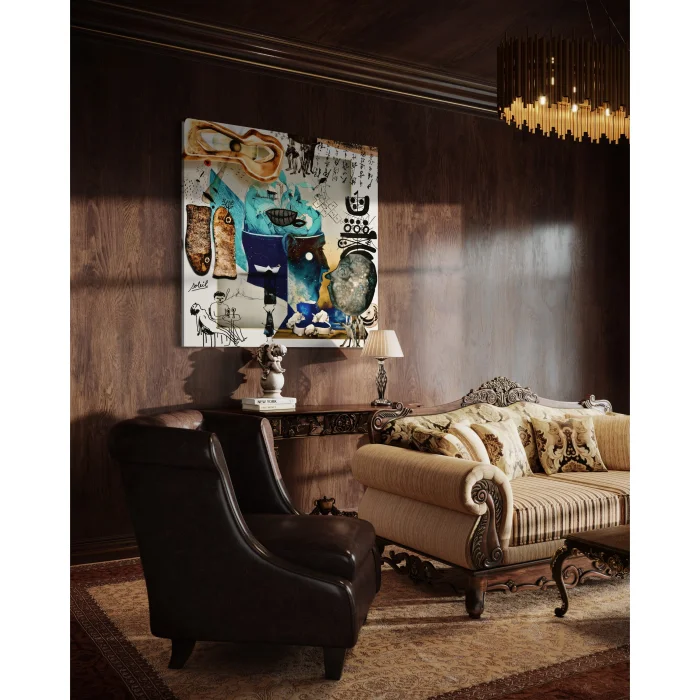 The artwork "Since" offers a wide range of symbols, ranging from mental depth represented through the figure of an inner thinker, to images of a woman oozing while drinking wine. This work manages to draw the viewer into different emotional layers by focusing on the intellectual difficulties of men and women from the past to the present, with examples of symbolism embroidered with modern figures standing side by side.