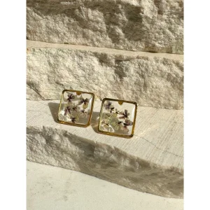 Each piece is filled with particles of Queen Anne's Lace flower, which are collected one by one by hand and then carefully plucked from the stem and pressed and dried.After the drying stage, these particles are carefully placed in handmade gold-plated frames and brought together with jewelry-grade crystal resin.